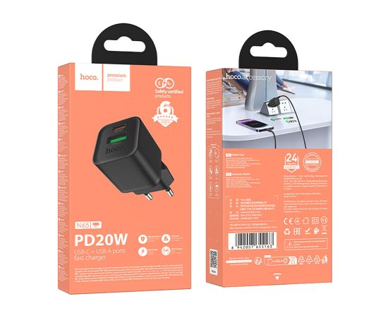Адаптер Сетевой Hoco N65 PD+QC3.0 USB/Type-C 3A/20W (black) (242954)
