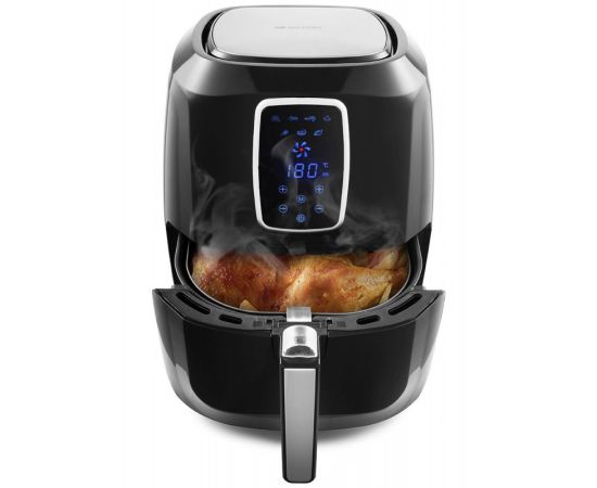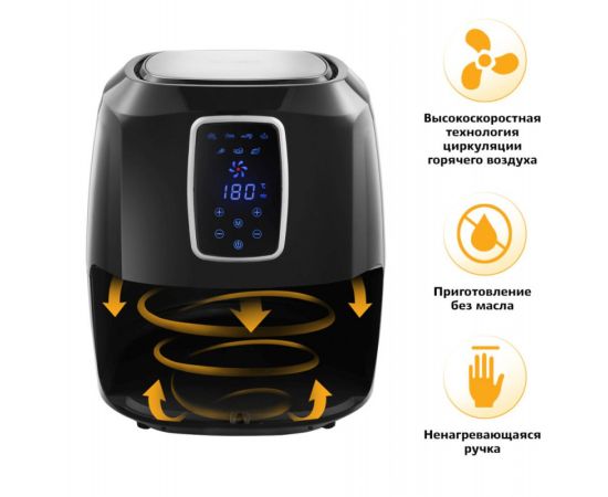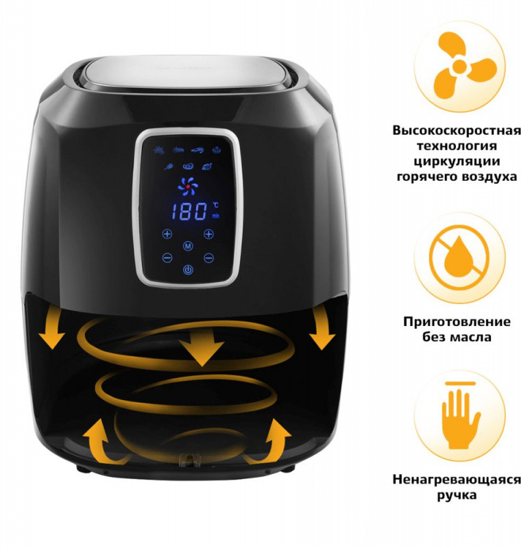 Описание: Может использоваться как аэрогриль, а также как аэрофритюрница и духовка, и позволяет готовить большинство продуктов без добавления масла. Аэрогриль оснащен электронным управлением, он имеет 7 автоматических программ и дисплей. Таймер от 0 до 60 мин с шагом 1 мин. Ёмкость корзины 5,2 л.