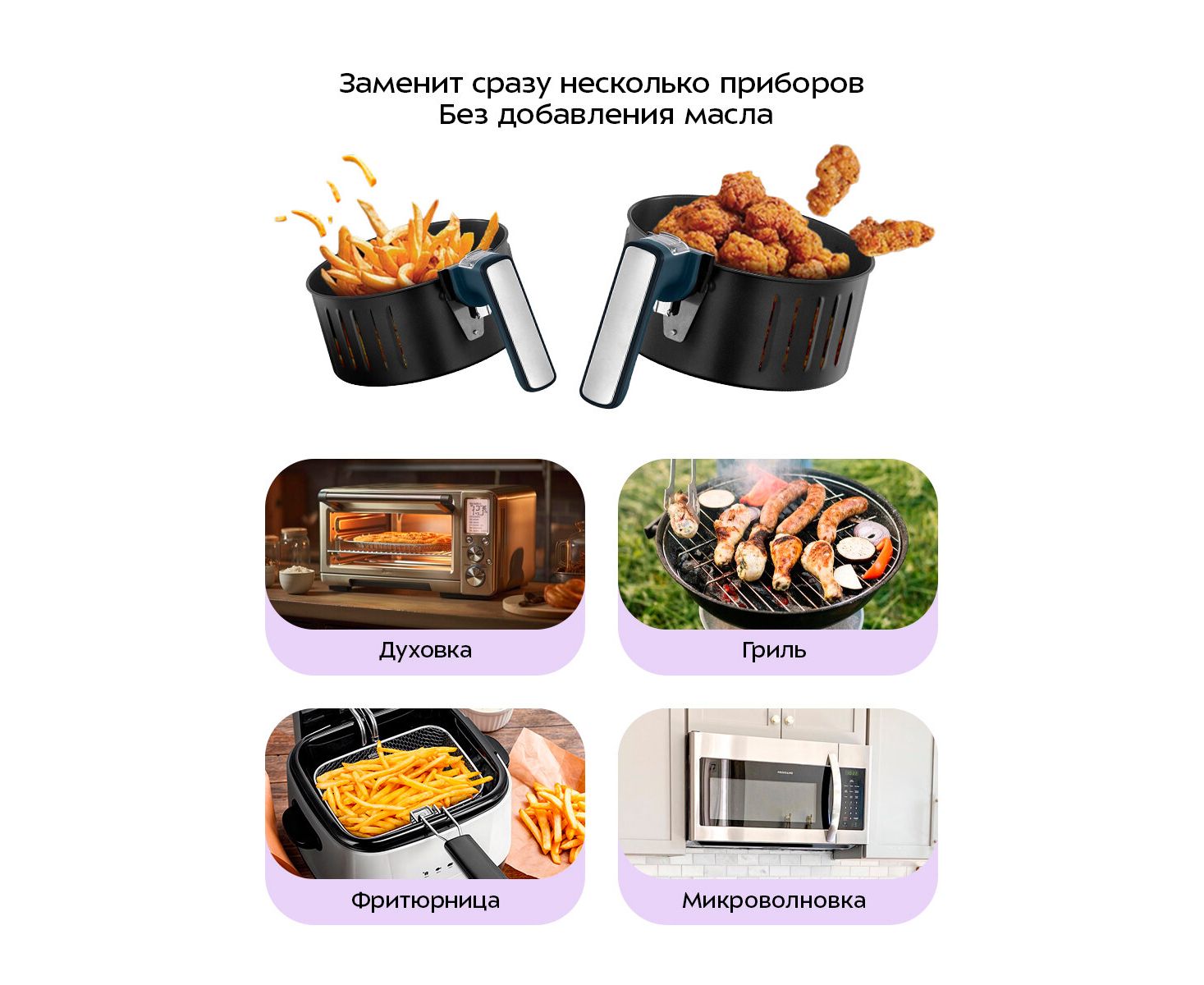 Аэрогриль КТ-8118 заменит сразу несколько приборов одним собой, так как имеет все функции, включающие в себя: запекание, как в духовке, гриль, фритюр и подогрев, как в микроволновке. При этом он не займёт много места на кухне!
