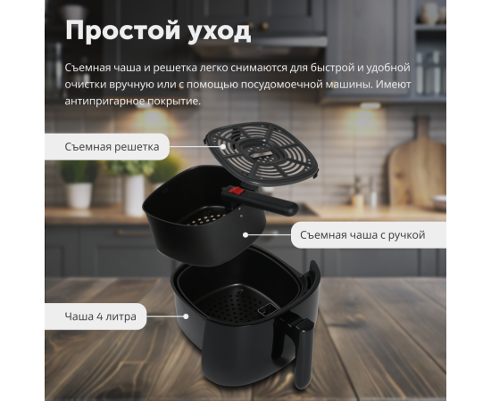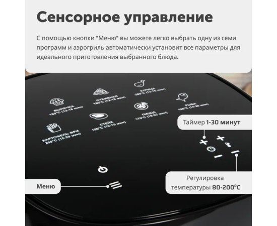 Аэрогриль с сенсорным управлением; Съемная чаша с ручкой; Решетка для жарки в электрофритюрнице; Руководство пользователя; Транспортировочная коробка + подарочная коробка