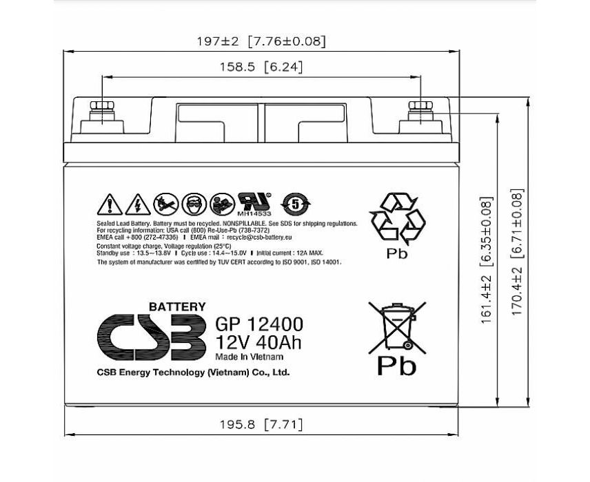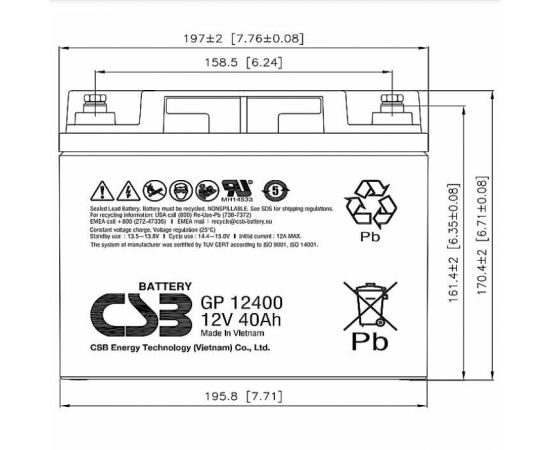 АКБ для ИБП 12В 40Ач CSB GP12400, 160W/cell, 480 Whr, 12.65 кг, (ШхГхВ) 197х165х170,4 мм (170,4 с клеммами)