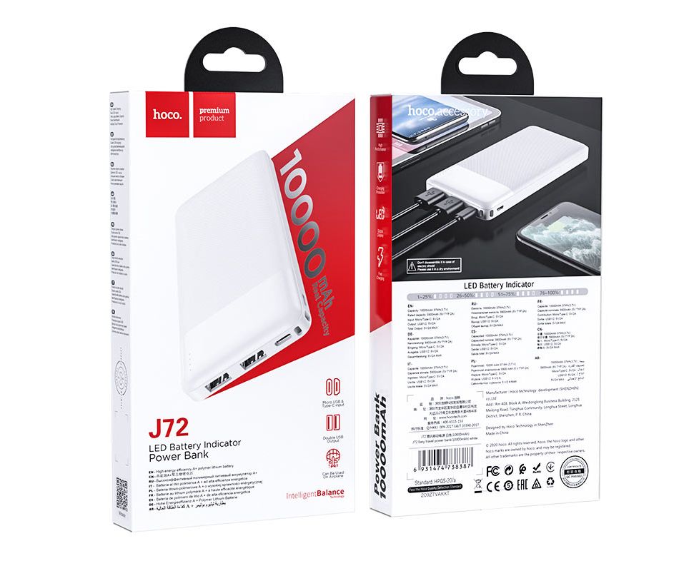 Аккумулятор внешний HOCO J72 Easy travel, 10000mAh 2USB 2.0A Li-pol цвет: белый