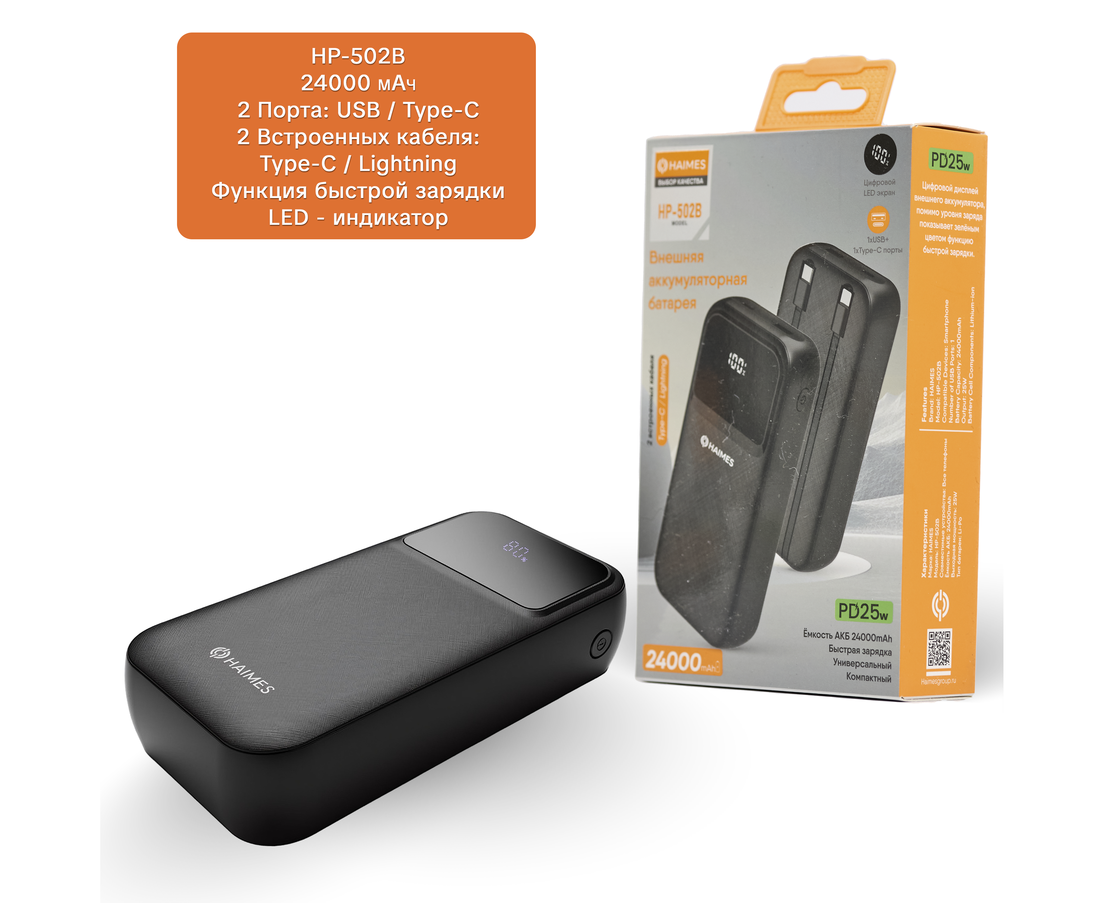 Аккумулятор внешний резервный, быстрая зарядка 25W, 24000 Mah, HAIMES, черный