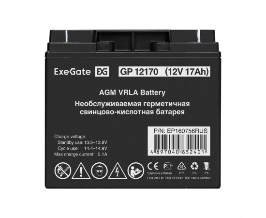 Аккумуляторная батарея ExeGate GP12170 (12V 17Ah, клеммы F3 (болт М5 с гайкой) 160756