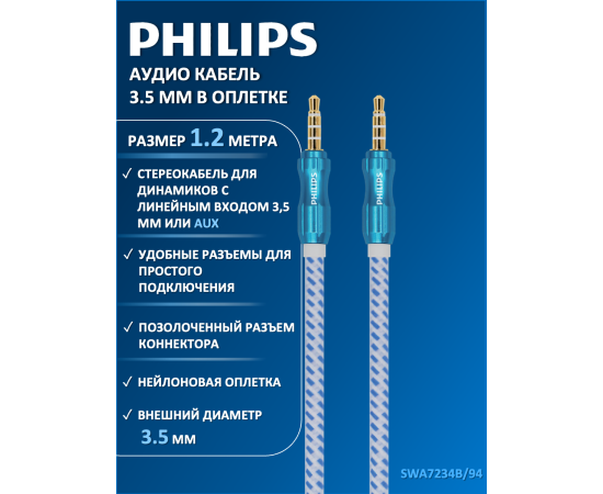 Аудио кабель Philips SWA7234B/94 3.5 мм, в оплетке, синий, 1.2 м для передачи звука между устройствами с выходом mini jack 3.5. Акустический кабель подходит для смартфонов, планшетов, iPod, iPhone, Samsung, наушников, портативных колонок, автомобильной аудиосистемы и музыкальных центров. Аудио-кабель JACK M - JACK M оптимальной длины 1.2 метра в мягкой нейлоновой оплетке и высоким качеством коннекторов, отлично подходит для различных температурных режимов и остается гибким и прочным во всевозможных условиях и ситуациях. Проводник из бескислородной меди высокой очистки для наилучшего качества передачи сигнала. Позолоченное напыление обеспечивает лучшую проводимость, меньшее сопротивление и окисляемость.
