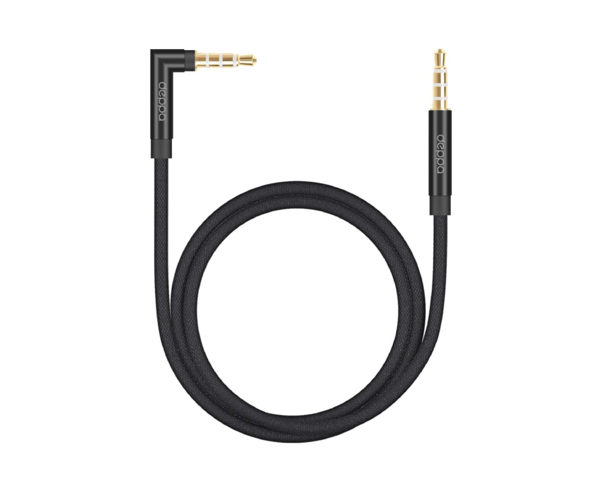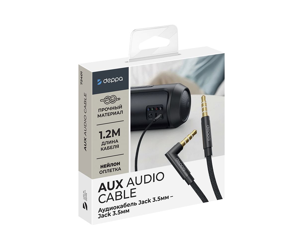 AUX аудиокабель Jack3.5мм - Jack3.5мм, 1.2м, нейлон, L-коннектор, черный, Deppa, 72401