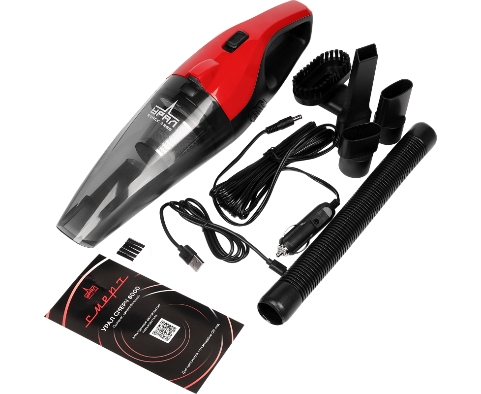 пылесос, гибкий удлинитель, набор щелевых насадок, насадка с щеткой, щетка для чистки, кабель зарядки от автомобильный сети, кабель зарядки USB