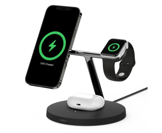 Беспроводная зарядная подставка Belkin BOOST Charge 3-в-1 с MagSafe - это удобный способ максимально быстро зарядить все ваши устройства Apple. Новый магнитный модуль быстрой зарядки заряжает новейшие Apple Watch Series 7 от 0 до 80% примерно за 45 минут. В то же время вы можете быстро и безопасно заряжать свой iPhone в портретном или ландшафтном режиме на зарядной подставке Magsafe и свои AirPods на беспроводной зарядной станции Qi.