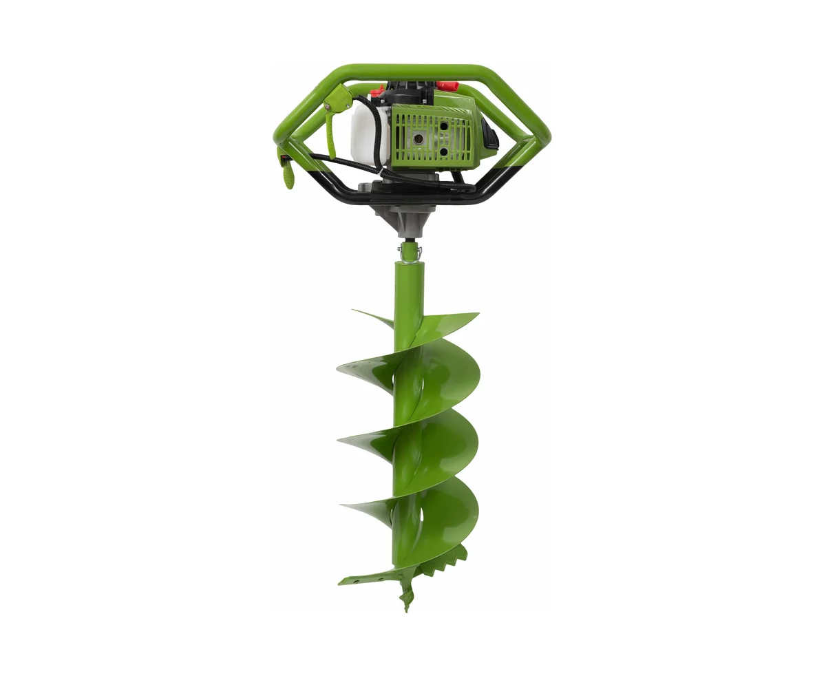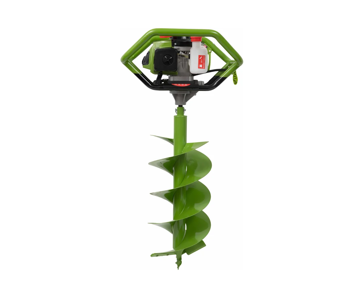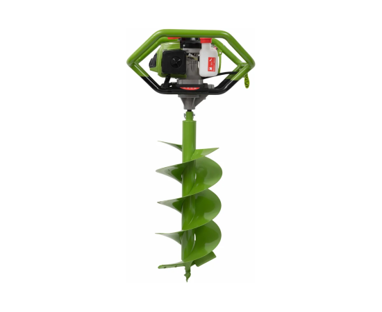 Максимальный диаметр бура составляет 300 мм, что делает его подходящим для различных задач. Устройство оснащено 2-тактным двигателем, который развивает до 8800 оборотов в минуту, обеспечивая стабильную работу. Емкость топливного бака в 1,6 литров позволяет длительное время работать без дозаправки. В комплект входит шнек, что упрощает подготовку к работе.