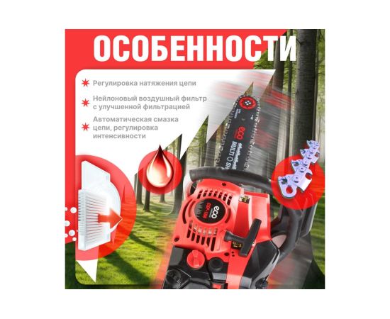 Удобно расположенные топливный насос (праймер) и винт натяжения цепи; хорошо сбалансированная конструкция; полноценный комплекс безопасности – инерционный тормоз, уловитель цепи, защита от случайного включения; антивибрационная система; автоматическая подача масла на трущиеся элементы пильной части.