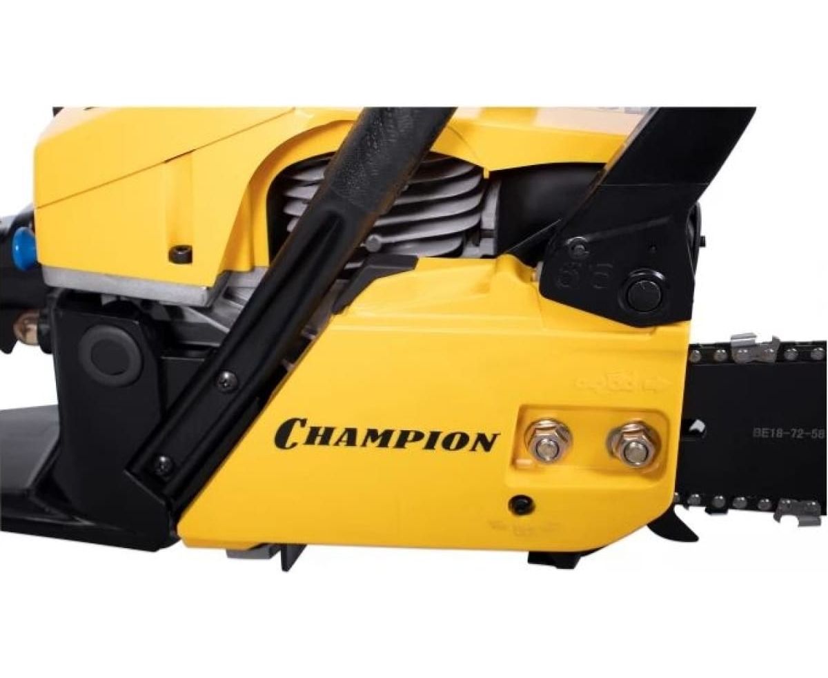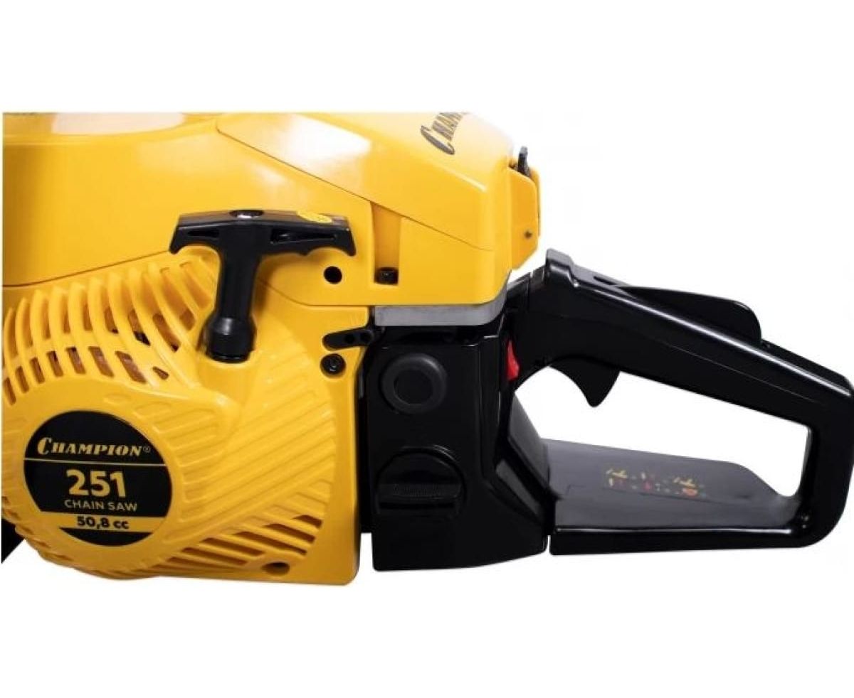 Бензопила Champion 251-15 – мощная бензиновая модель позиционируемая производителем как профессиональная. Мощность двухтактного мотора пилы составляет 3,13 лошадиные силы, а длинна полотна достигает 45 см. Натяжение цепи боковое, сама шина имеет четыре точки крепления ведомой звездочки. Стартер у пилы ручной с системой легкого запуска, упрощающей продергивание шнура кик стартера на 30%.