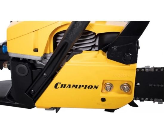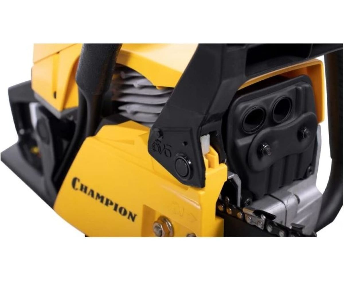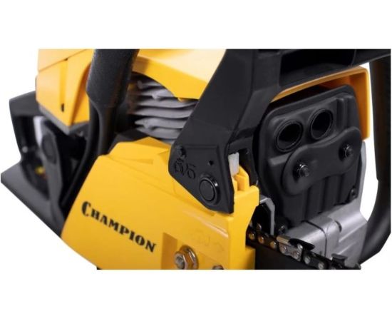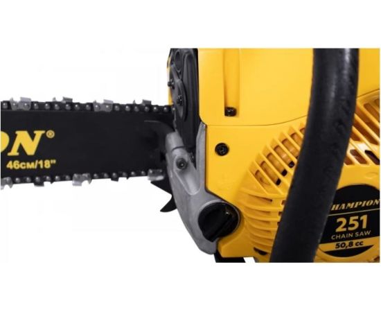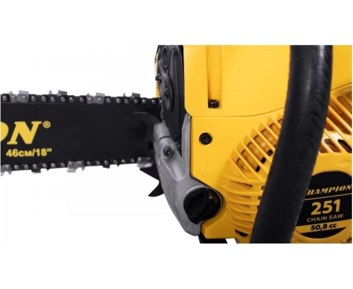 У цепи пилы профессиональный шаг 0,325 дюйма под широкий паз 1,5 мм. Бензопила Champion 251-18 оборудована подогревом карбюратора, позволяющим эксплуатацию при отрицательных температурах. В основании пильной шины есть стальной зубчатый упор, упрощающий распиловку бревен больших диаметров. Подача смазывающего масла на шину и цепь производиться автоматически посредством металлического насоса. Двигатель бензопилы работает на смеси двухтактного масла с бензином в пропорции 1 к 50.