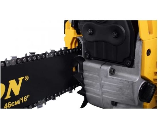 Бензопила оборудована системой виброгашения и всеми необходимыми системами безопасности, такими как центробежный тормоз цепи и цепеуловитель.