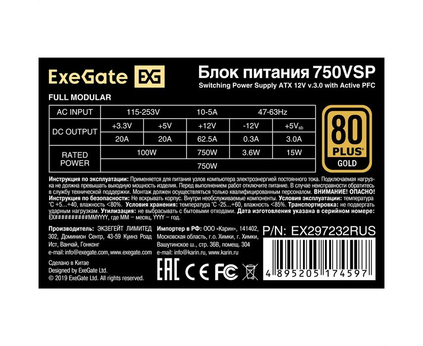 Блок питания Exegate 750VSP FC EX297232RUS 750W 80 Plus Gold (ATX3.0, APFC, КПД 90проц., 120mm fan, 24pin, 2x(4+4)pin)