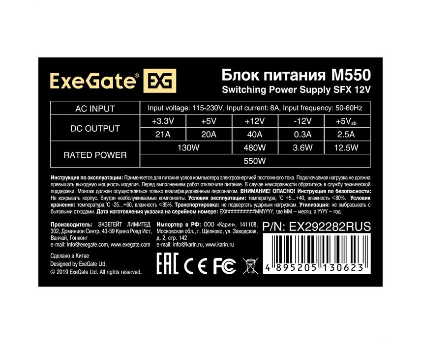 Блок питания ExeGate M550 EX292282RUS 550W (SFX, APFC, КПД 87% (80 PLUS Silver), 8cm fan, 24pin, 4+4pin, 3xSATA