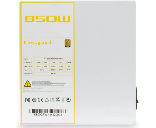Блок питания HSPD HSK-850GF-WH 850W 80+ Gold (ATX, 3.1, PCIe 5.1, Full modular, 1x24(20+4)pin mesh 550mm, 2xCPU 8(4+4)pin 700mm, 2xPCIe*2 8(6+2)pin 60