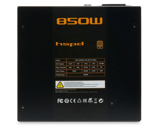 Блок питания HSPD HST-850GF-BK 850W 80+ Gold (ATX, 2.52, Full modular, 1x24(20+4)pin 600mm, 2xCPU 8(4+4)pin 700mm, 2xPCIe*2 8(6+2)pin