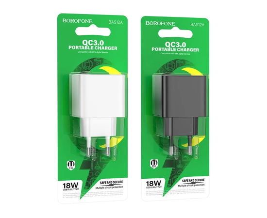 Блок питания сетевой 1 USB Borofone BAS12A Erudite, пластик, QC3.0, цвет: чёрный (1/70/280)