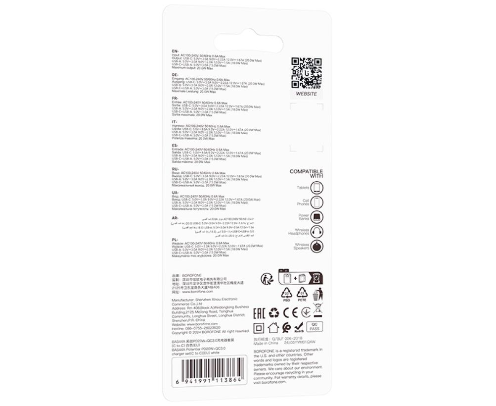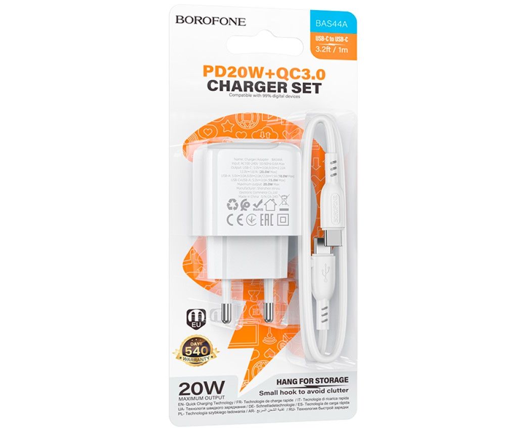 Сетевое зарядное устройство BOROFONE BAS44A/ СЗУ + кабель C-C 1m/PD + QC 3.0/ 2 USB: Type-C + Type-A/ Выход: 20W + 18W/ Белый