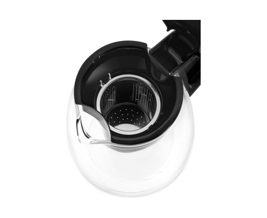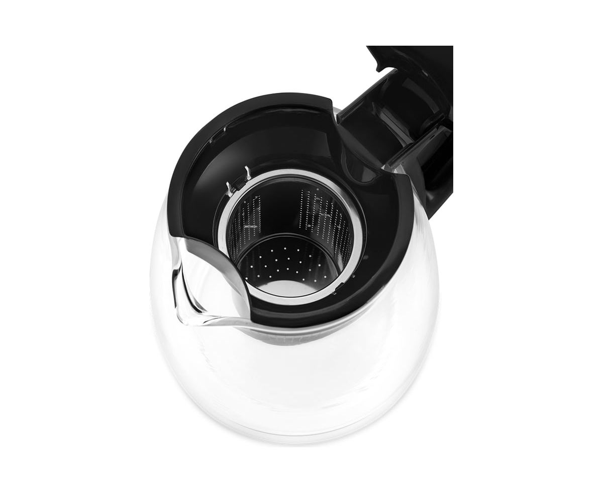 Кувшин для заварки изготовлен из термостойкого стекла и имеет съёмный фильтр для чая или кофе. В месте установки кувшина на базу присутствует скрытый нагревательный элемент с функцией поддержания тепла. Корпус чайника выполнен из стекла с вставкой из пластика. Крышка выполнена из сочетания нержавеющей стали и пластика и легко открывается с помощью кнопки сверху. Мерная шкала находится на боковой стороне стеклянной части корпуса.