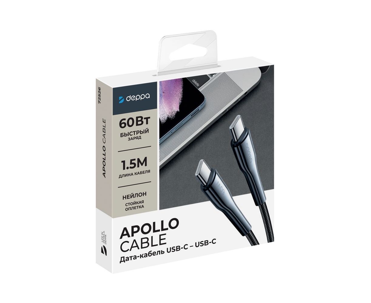 Дата-кабель Apollo USB-С - USB-С, 60Вт, 1,5м, черный, Deppa