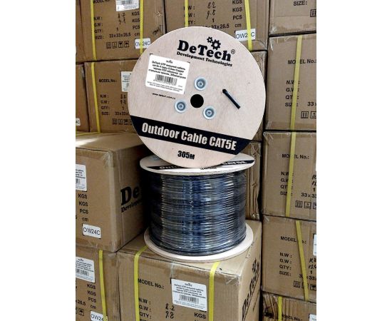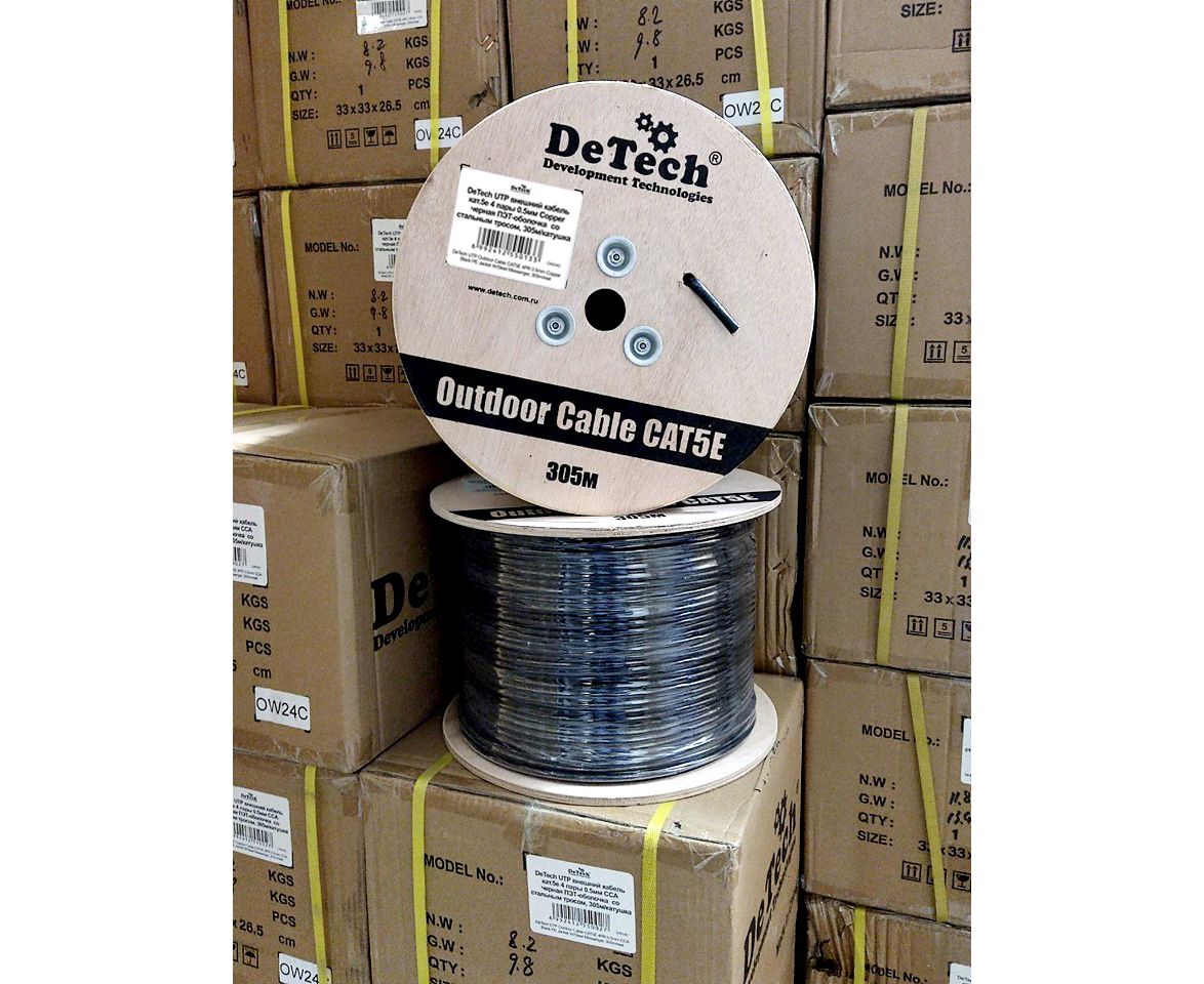 DeTech UTP внешний кабель кат.5е 4 пары 0.5мм CU черная ПЭТ-оболочка со стальным тросом, 305м/катуш