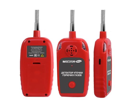МЕГЕОН 08013 - портативный детектор, который позволяет быстро обнаружить пары горючих газов и жидкостей. Для удобства работы прибор оборудован выносным датчиком на зонде полужёсткой конструкции. Благодаря этому улучшается доступ в труднодоступные места. При обнаружении паров изделие оповестит о наличии звуковым и световым оповещением. Плавная настройка уровня чувствительности даёт возможность компенсировать естественное присутствие инертных и других газов в воздухе, которое может повлиять на правильность срабатывания сигнализации. Эксплуатация не требует специальных навыков и умений. Достаточно нажать кнопку включения, дождаться прогрева чувствительного элемента, настроить сигнализацию в условиях отсутствия примесей исследуемых углеводородов в окружающей атмосфере, а затем проведите поиск возможной утечки. Инструмент станет прекрасным помощником профессионалов и любителей при проведении проверки газового оборудования, вентилей и трубопроводов в промышленных и бытовых строениях.