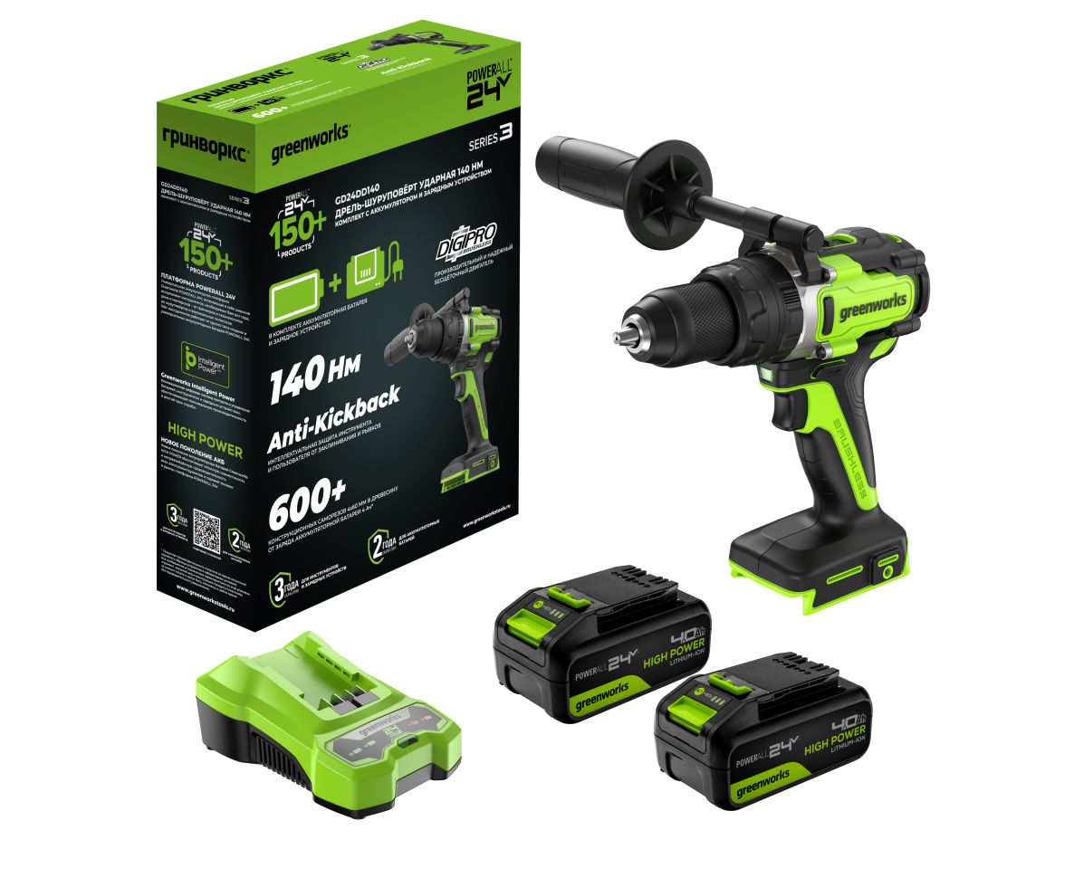 Дрель Greenworks GD24DD140 24V сочетает в себе три функции: сверление с ударом, сверление без удара и работа с крепежами. Это позволяет использовать устройство в работе с самыми разными материалами, а функция реверса дает возможность не только закручивать, но и выкручивать крепежи. Модель развивает исключительно высокий крутящий момент 140 Нм и оснащена дополнительной рукояткой для работ, требующих усилий, поэтому справится не только с бытовыми, но и с более сложными задачами