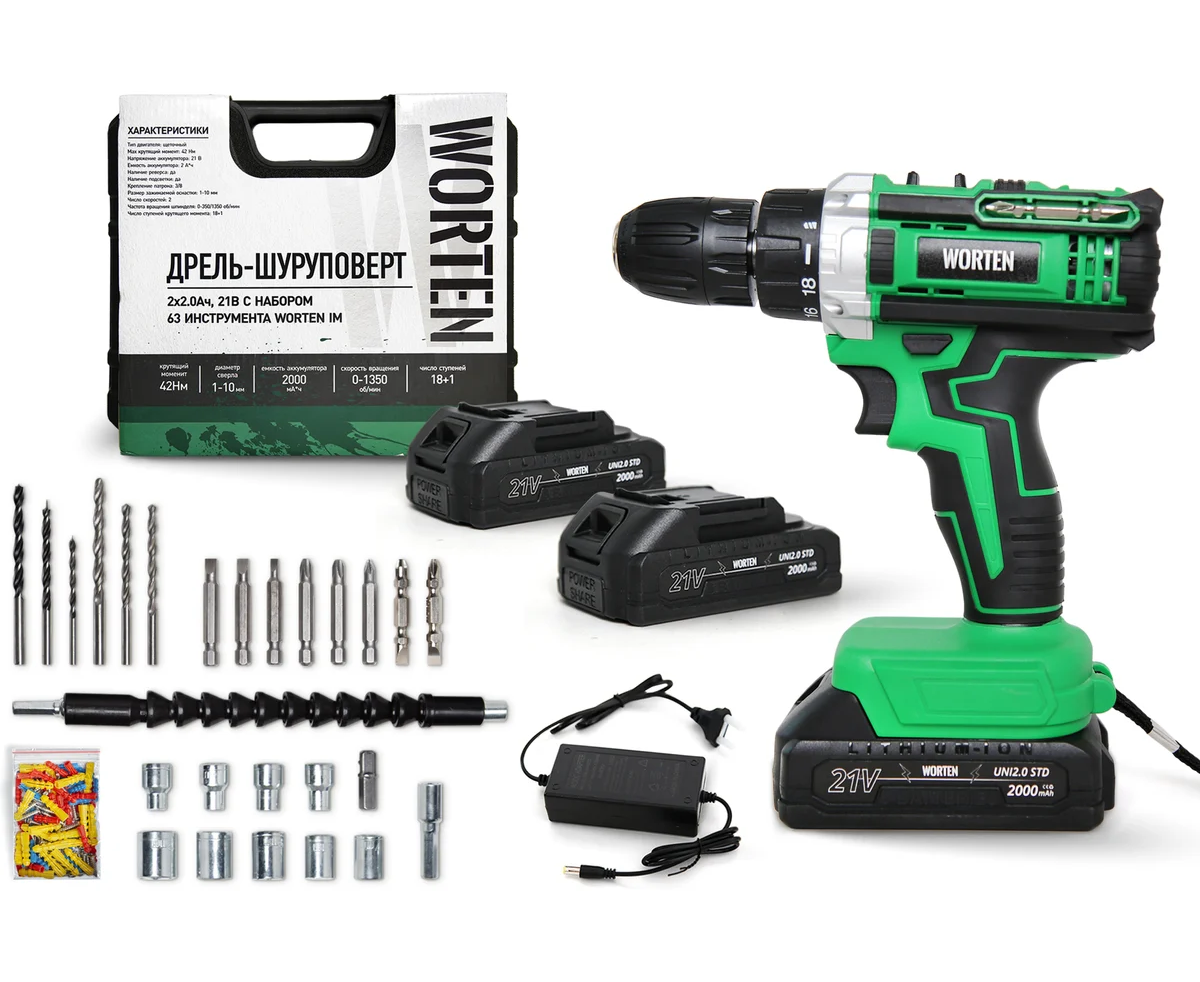 Дрель-шуруповерт WORTEN IM КА-90000574 2x2.0Ач+ЗУ, 21В с набором 63 инструмента