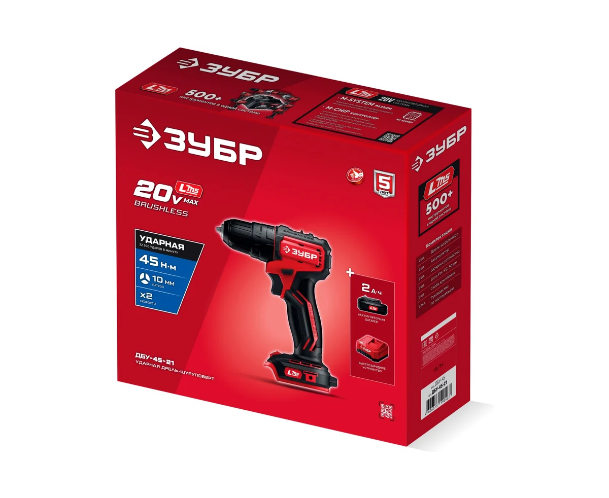 ЗУБР 20 В, 45 Н·м, 1 АКБ LMS (2 А·ч), бесщеточная ударная дрель-шуруповерт ДБУ-45-21 - инструмент из единой аккумуляторной системы LMS для 500+ инструментов.