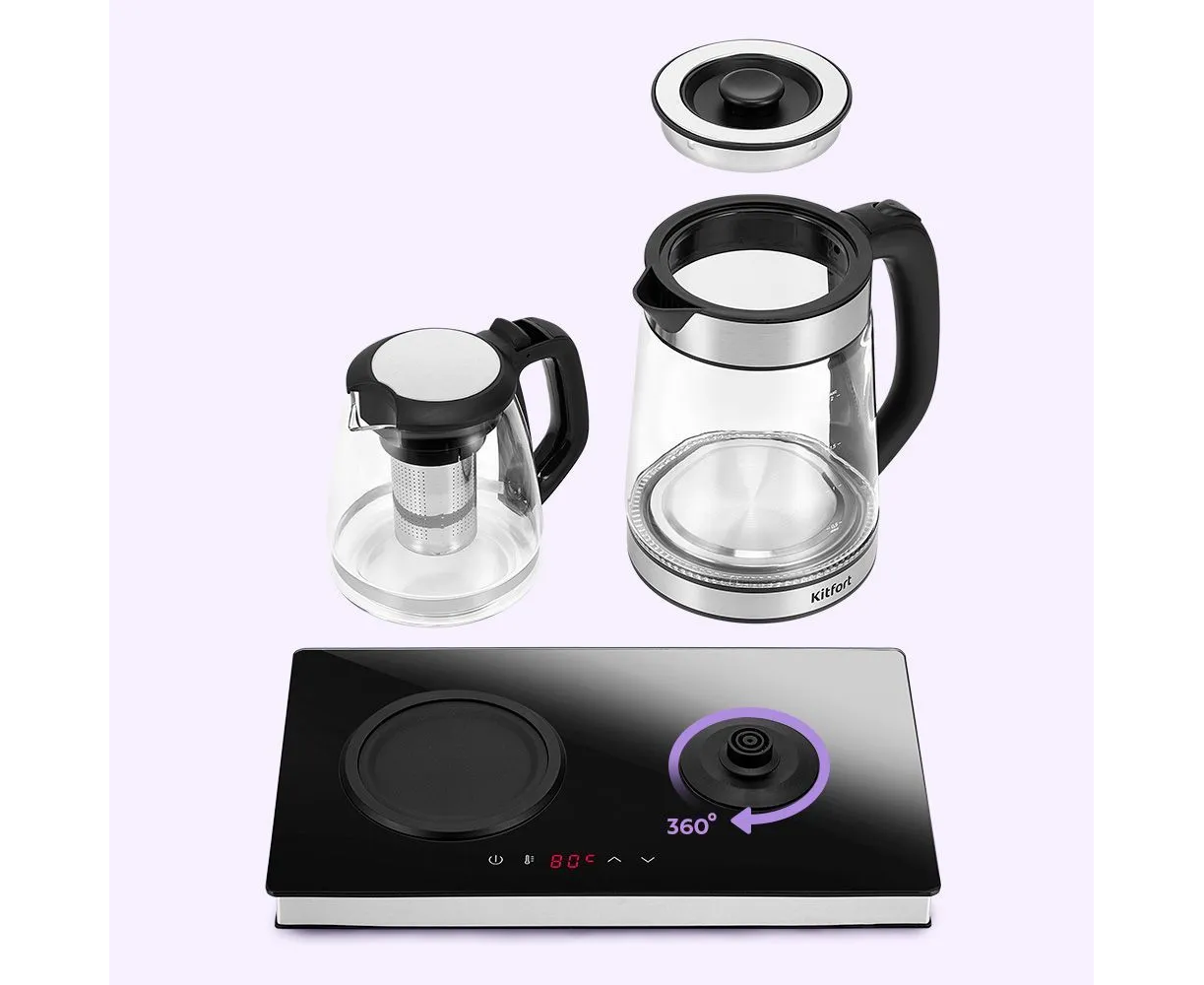 Конструкция чайника: Заварочный чайник, Дисплей, Вращение подставки на 360°, Светоиндикатор работы
