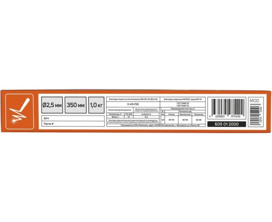 Электроды PATRIOT МР-3С, диам. 2,5мм, длина 350мм, уп. 1кг (605012000)