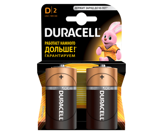 Алкалиновая (щелочная) батарейка типа LR20 / D / MN1300. Благодаря особой технологии Duralock неиспользованные батарейки Duracell могут сохранять заряд до 10 лет при хранении в обычных условиях. С этими батарейками Вы можете полностью положиться на свое устройство.