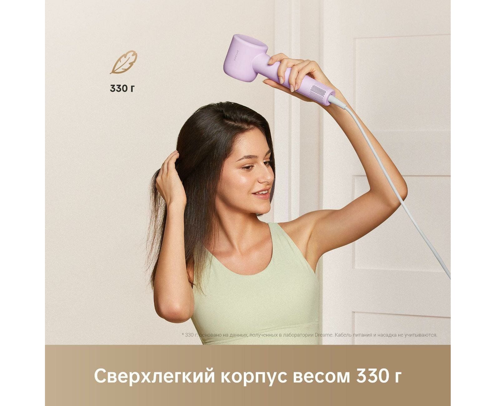 Фен Dreame Hair Gleam Lilac отличается компактной и легкой конструкцией, что делает эксплуатацию удобной. Модель габаритами 25,5х8,2х7,6 см и весом 330 г выполнена в высокопрочном пластиковом корпусе со съемной защитной решеткой, благодаря чему достигается долгий срок службы.