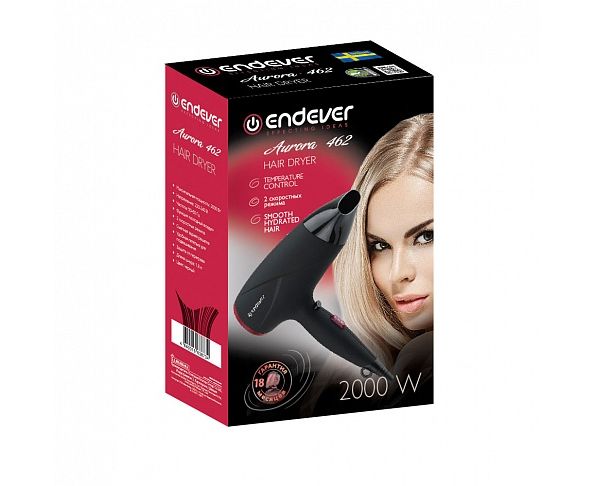 Фен Endever Aurora-462, Мощность 2000 Вт, Режим «холодный воздух», 2 скоростных режима, холодный воздух, покрытие Soft Touch