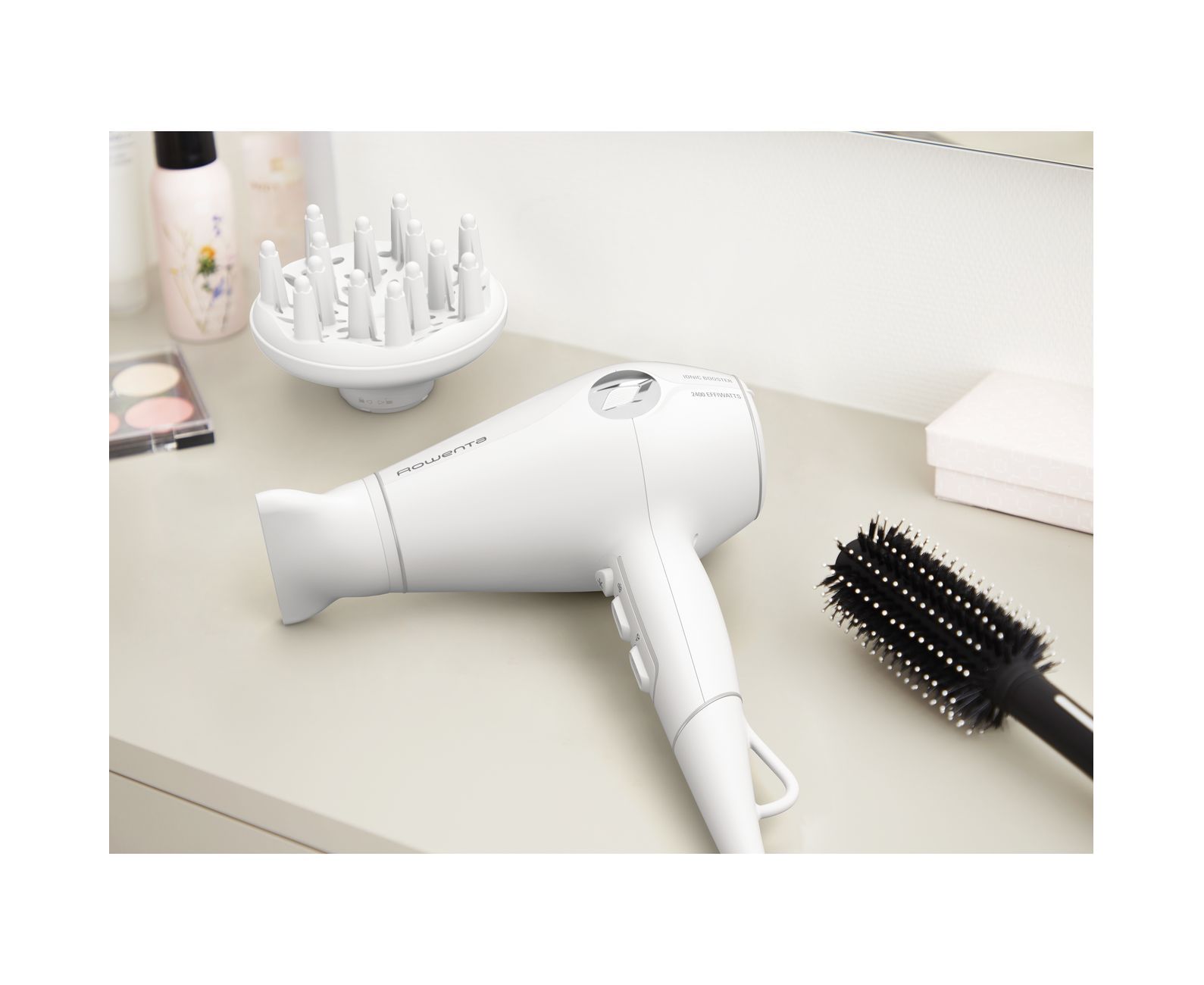 Фен Rowenta – это сочетание компактности, удобства использования и высокой мощности. Гибридный мотор и особая конструкция вентилятора позволили значительно увеличить силу потока. С его помощью вы быстро высушите и уложите волосы любой длины, а также придадите им эффектный прикорневой объём.