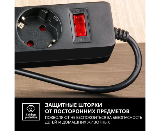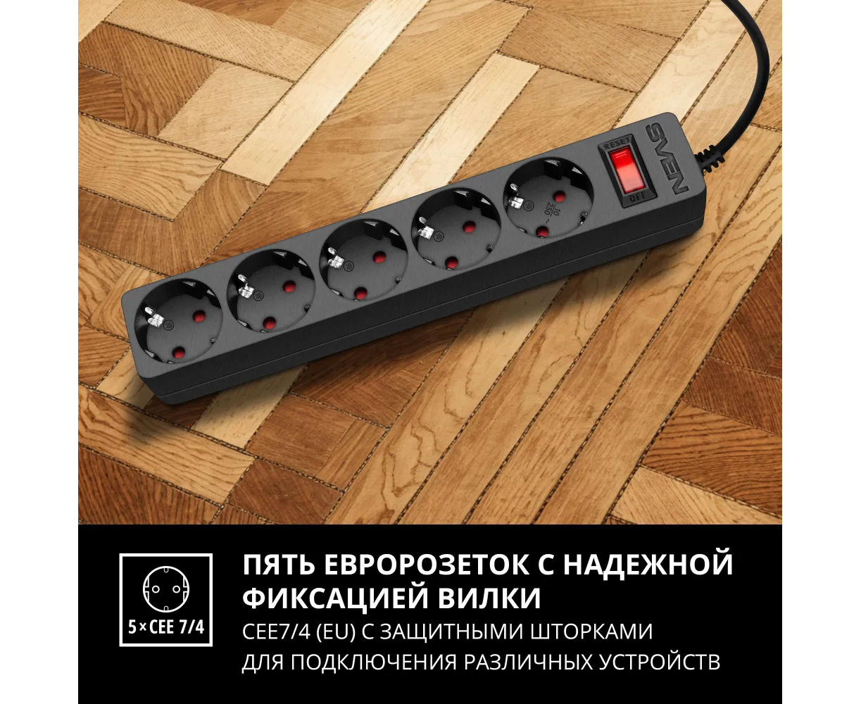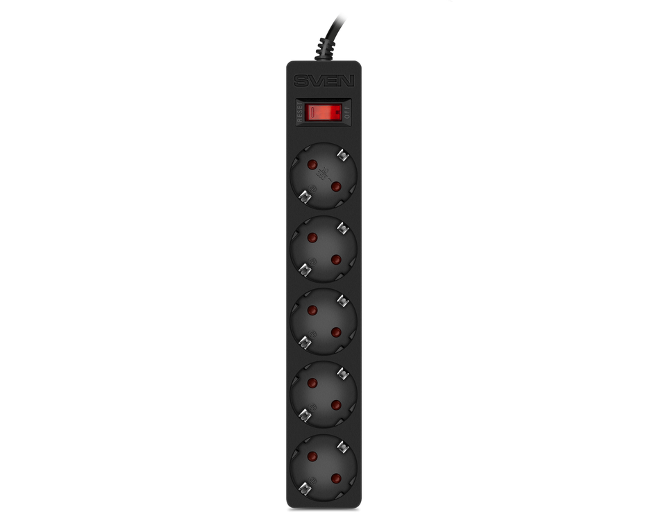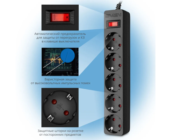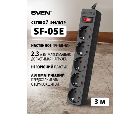 Фильтр SVEN SF-05E 3,0 м (5 розеток с защитными шторками) черный, цветная коробка