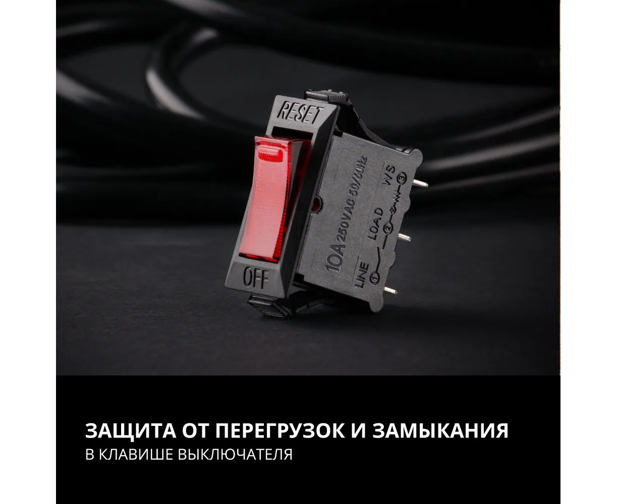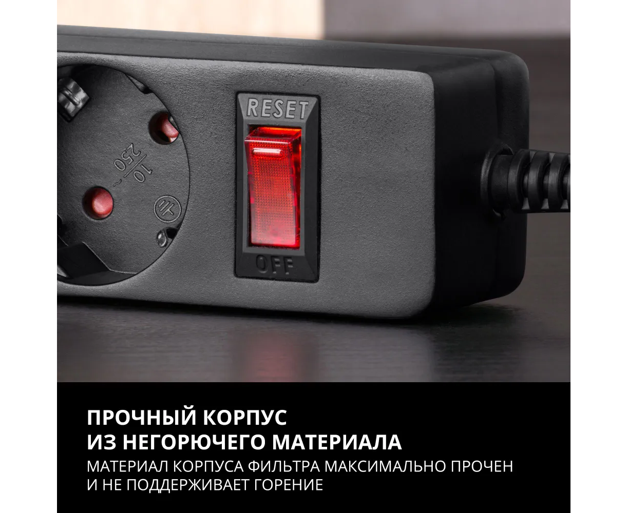 Прибор оборудован кабелем длиной 3 метра с розеткой типа EURO. Благодаря большой длине кабеля устройство можно разместить на достаточном удалении от основной розетки, а, следовательно, и организовать рабочее место в удобном для пользователя месте. Для подключения приборов в конструкции фильтра предусмотрено 5 розеток. Представленная модель идеально подойдёт для использования дома и в офисе.