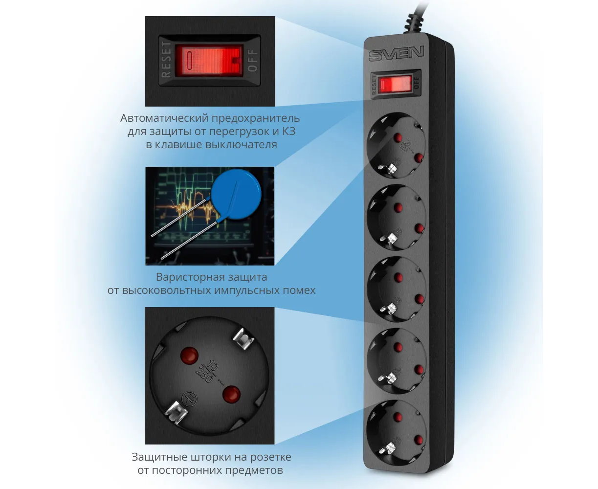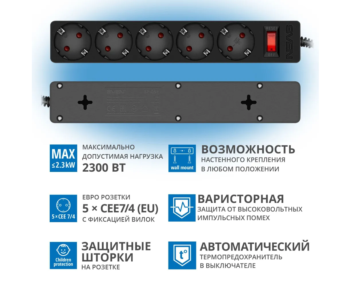 При необходимости представленная модель может использоваться и в качестве обычного «разветвителя». Устройство изготовлено из качественных материалов. Прочный корпус обеспечивает надёжную защиту элементов сетевого фильтра от ударов и повреждений. Система защиты от перегрузки позволяет предотвратить выход из строя Sven SF-05E из-за подключения к нему слишком высокой нагрузки.