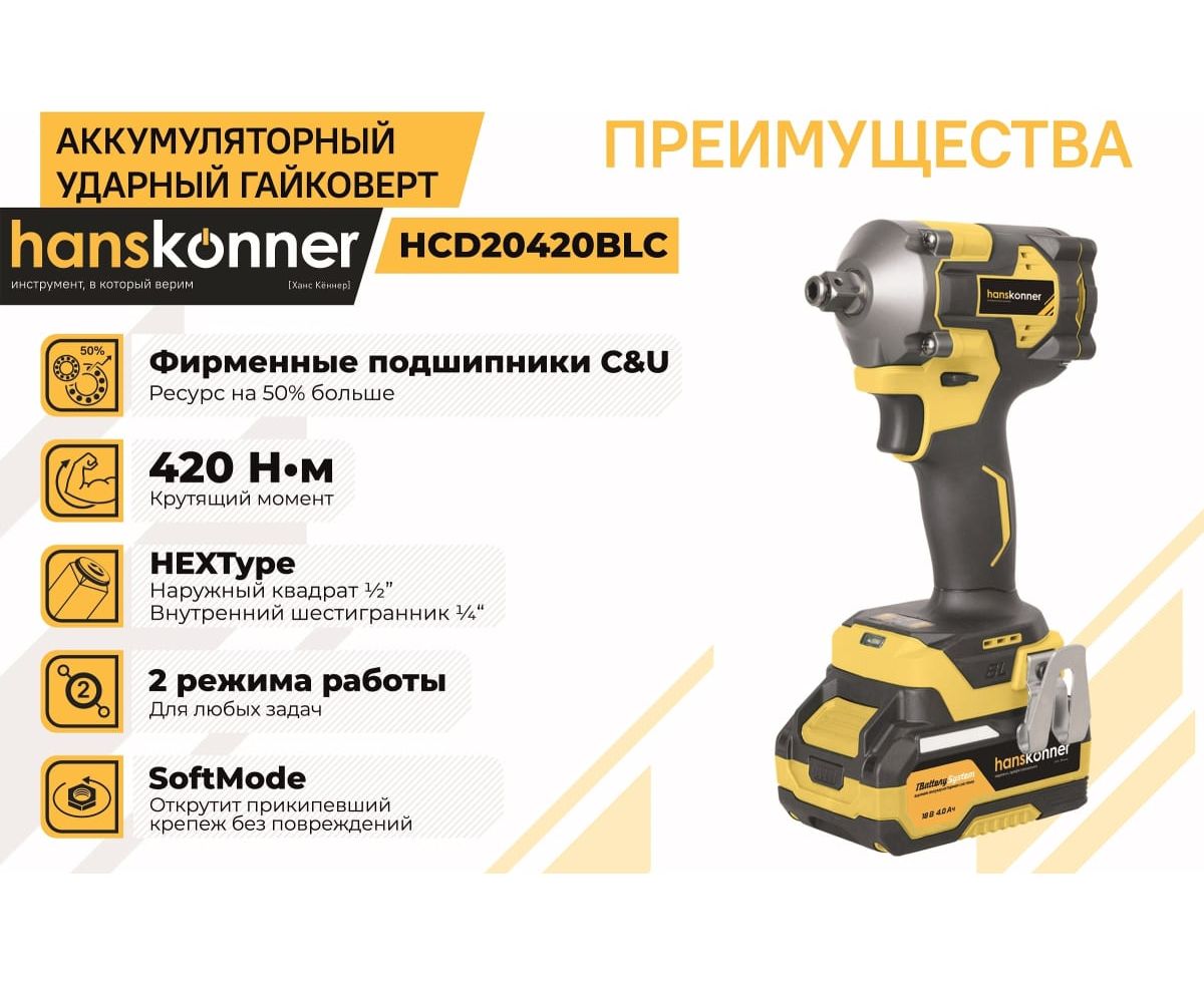 Гайковерт аккуммуляторный Hanskonner HCD20420BLC с акк и ЗУ