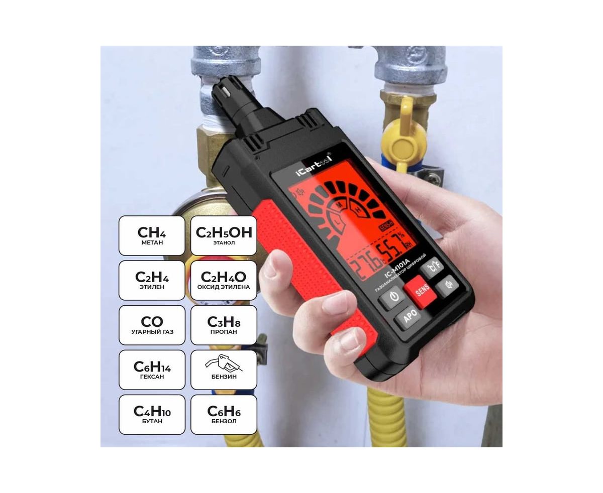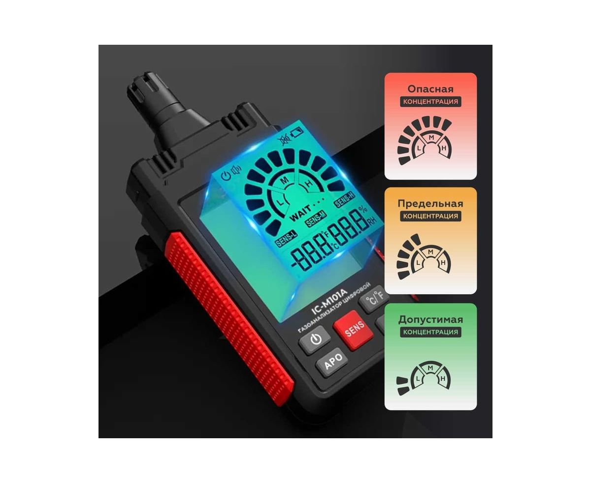 Цифровой газоанализатор IC-M101A предназначен для измерения объемной доли горючих газов, воспламеняющихся веществ и вредных паров. Контролирует превышение допустимой концентрации вредных паров в помещениях бытового и производственного назначения, а также используется для измерения температуры и относительной влажности окружающей среды.