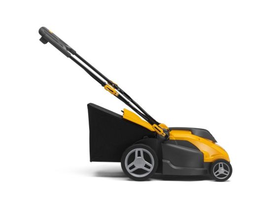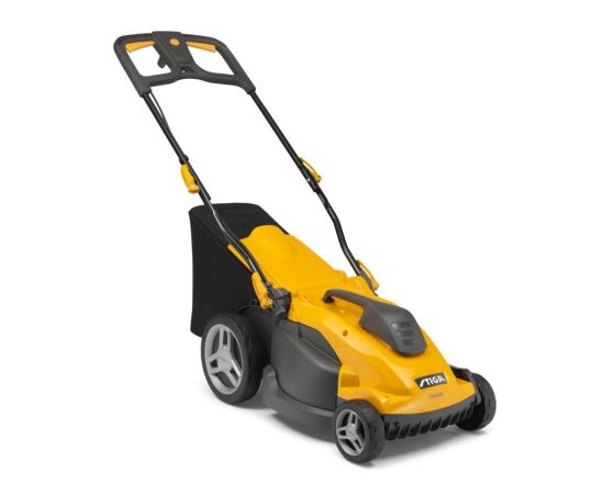 Электрическая механическая газонокосилка с двигателем мощностью 1600 Вт и травосборником объемом 40 литров с функциями заднего выброса и мульчирования.