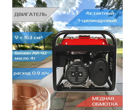 BR2500-CU оснащен четырехтактным бензиновым двигателем, работающем на АИ-92 бензине. Он обладает мощностью 5,5лс и имеет воздушное охлаждение. Емкость бака для топлива - 15л. Полной заправки будет достаточно на девять часов беспрерывной работы при среднем уровне загрузки. На корпусе генератора размещены две обычные розетки 32А и 16А. Медная обмотка увеличивает срок службы генератора. контролировать напряжение можно посредством простого вольтметра, находящегося на передней панели корпуса.
