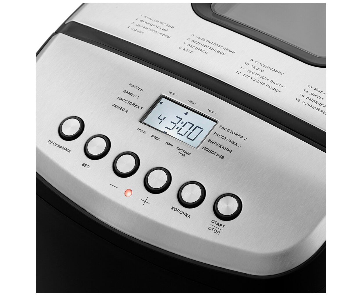 выбор цвета корочки, таймер, регулировка веса выпечки, пользовательский режим, поддержание температуры