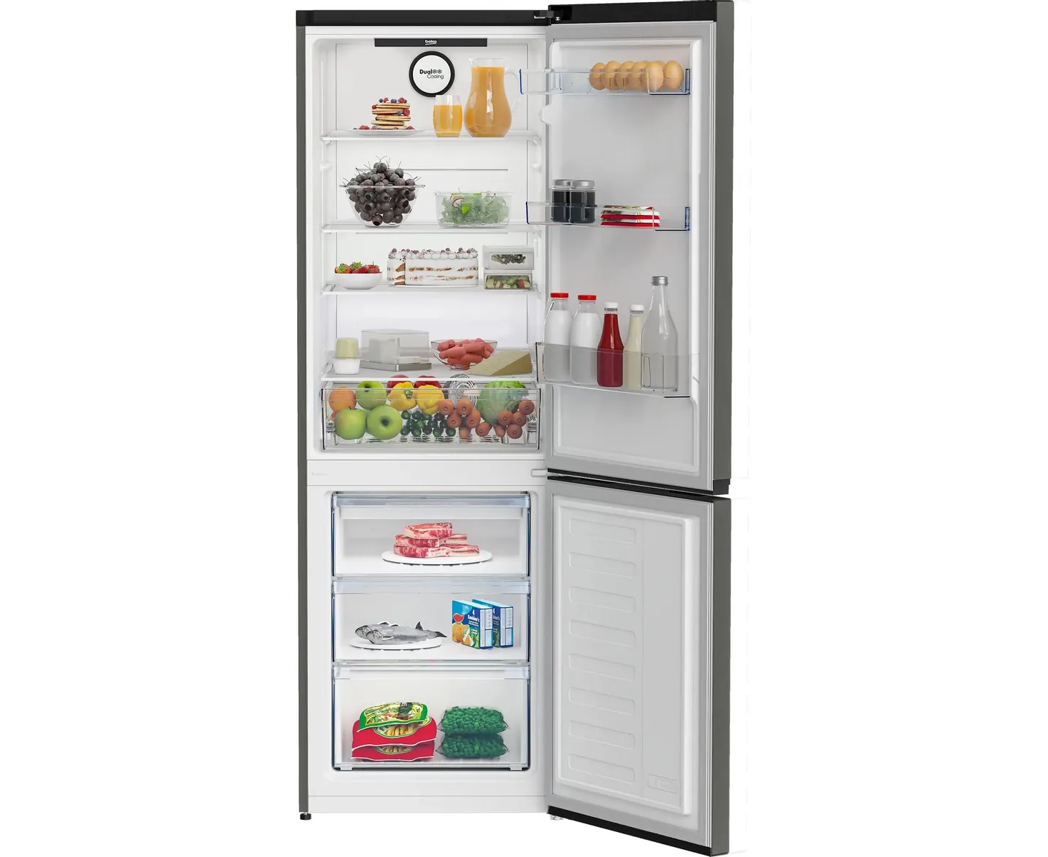 Размеры (ВхШхГ), см: 186x59,5x65. Общий объем брутто, 368 л. Общий полезный объем 320 л (холод. ОТД: 220 + мороз. ОТД:100). 1 компрессор (R600a). Электронное управление с дисплеем. Двухконтурная система охлаждения No Frost Dual Cooling. Уровень шума, дБ 38. Энергопотребление, кВтч/год: 337. Время сохранения температуры без электричества ч: 21. Перенавешиваемые двери. Встроенные ручки. Режим "Отпуск". Режим экономии энергии. Холод. ОТД: LED освещение. Количество ящиков: 1. Регулируемые полки из закаленного стекла: 3. Дверные полки, шт: 3. Подставка для яиц. Мороз. ОТД: быстрое замораживание Quick Freeze, 3 отделения. Мощность замораживания, кг/24 ч: 6. Климатический класс SN-T. Класс энергоэффективности A+. Цвет: Серебристый