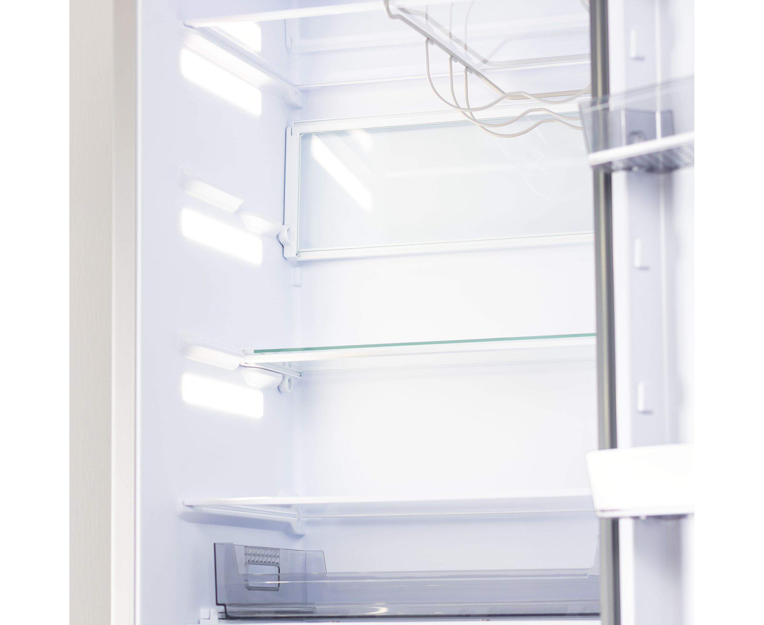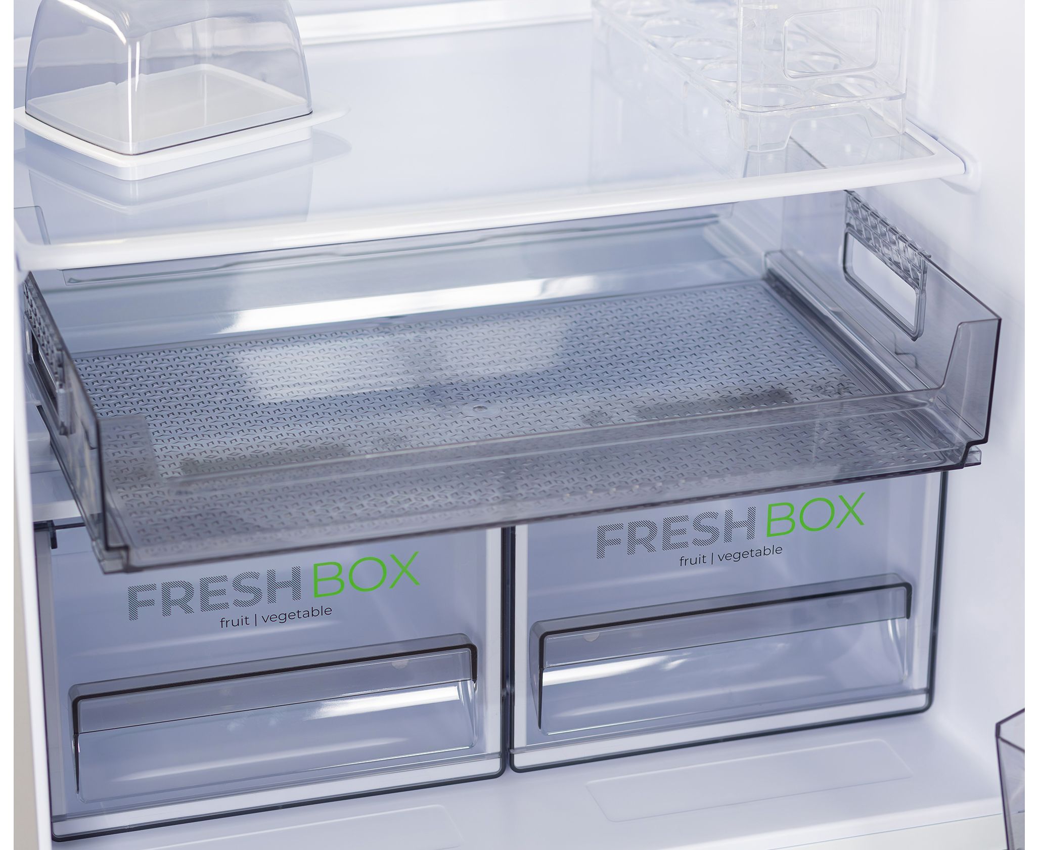 Комплектация Контейнер для 20 яиц, 2 складные полки, выдвижной лоток, полка для бутылок, масленка