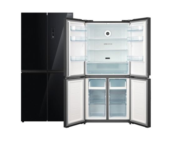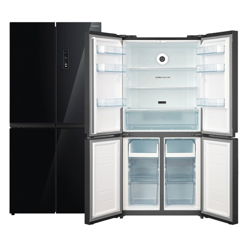 количество камер: трехкамерный; расположение морозильной камеры- снизу, размораживание морозильной камеры- No Frost, общий объем 466л, защита от детей, цвет: черный