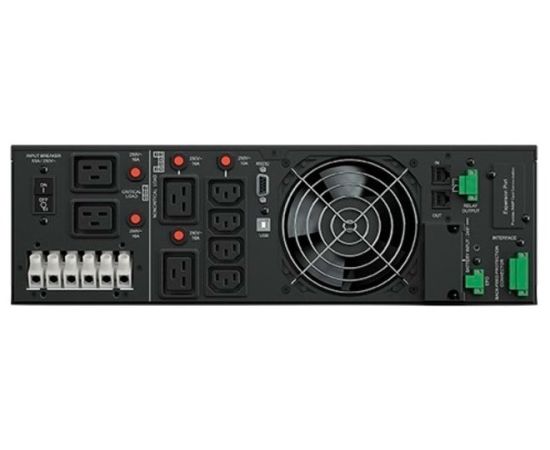 1-фазное входное напряжение, выходная мощность 10000 ВА / 9000 Вт, 4 мин работы при полной нагрузке, 11 мин работы при половинной нагрузке, выходных разъемов: 9, разъемов с питанием от батареи: 9, высота 3 U, интерфейсы: USB, RS-232, время зарядки 5 ч
