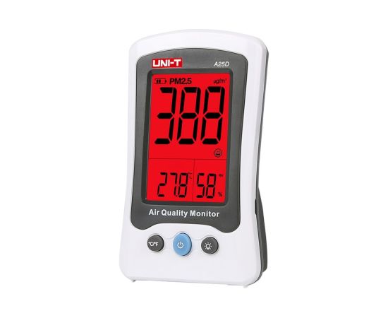 Измеритель качества воздуха UNI-T A25D позволяет анализировать содержание в воздухе частиц размером 2.5 мкм и менее. Измерения должны производиться при температуре 18 … 28°C и относительной влажности 45 … 75%. Также позволяет измерить содержание в воздухе формальдегида, температуру и влажность. Есть цветовая сигнализация о превышении заданных параметров.