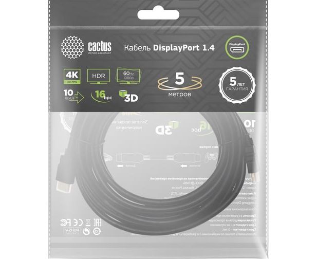 Кабель аудио-видео Cactus CS-DP-DP-1.4-5 DisplayPort(m)/DisplayPort(m) 5м позолоч.конт. черный